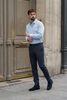 Größenberatung Hessel ist 1 Meter 88 groß und trägt Größe 43. Die Passform ist Slim fit.
