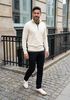 Größenberatung Damian ist 1 Meter 87 groß und trägt Größe L. Die Passform ist Regular fit.